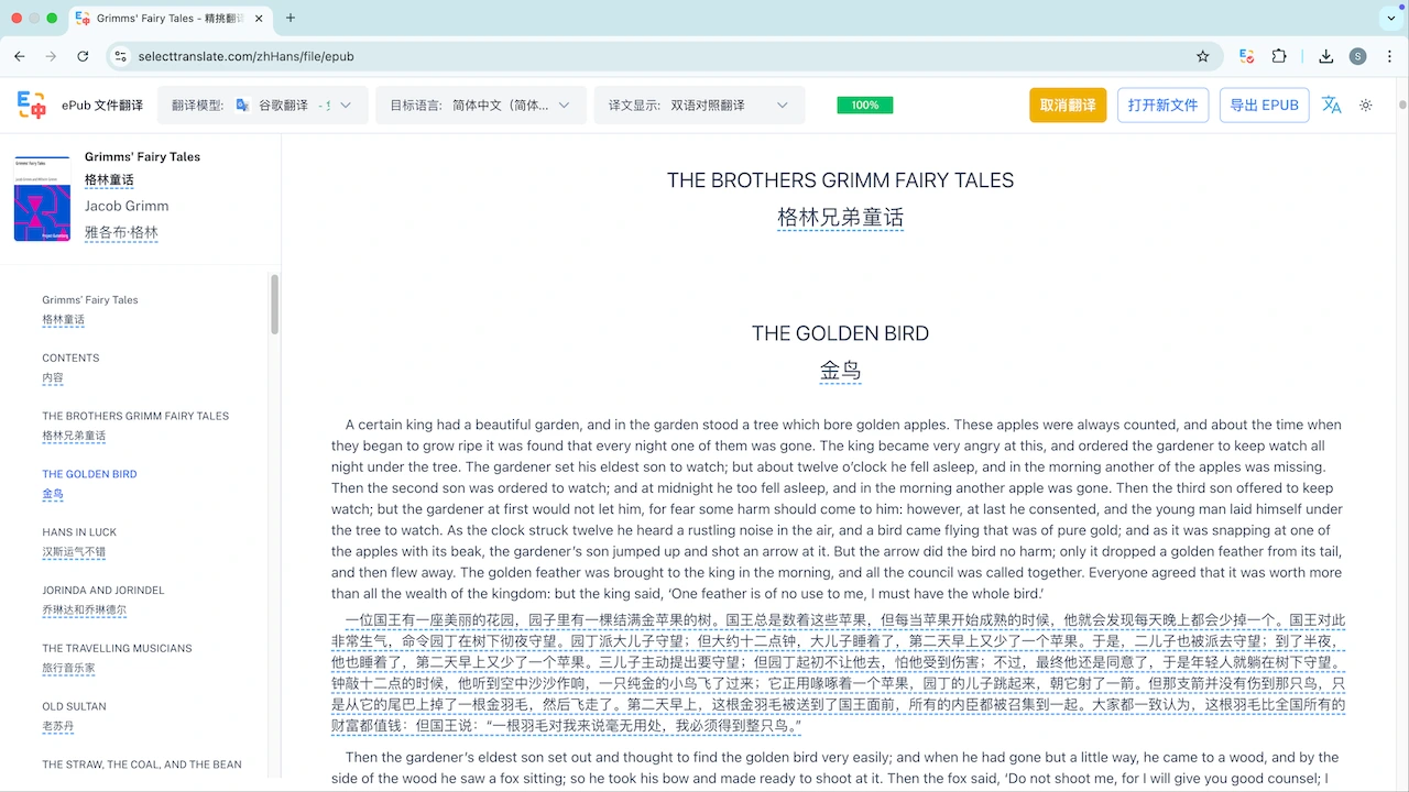 借助精挑翻译,可以轻松将各种外语 ePub 电子书转换为双语对照版本,完美兼容 Kindle 等各种电子书阅读器,帮助您打破语言壁垒,畅享全球优质文学资源。