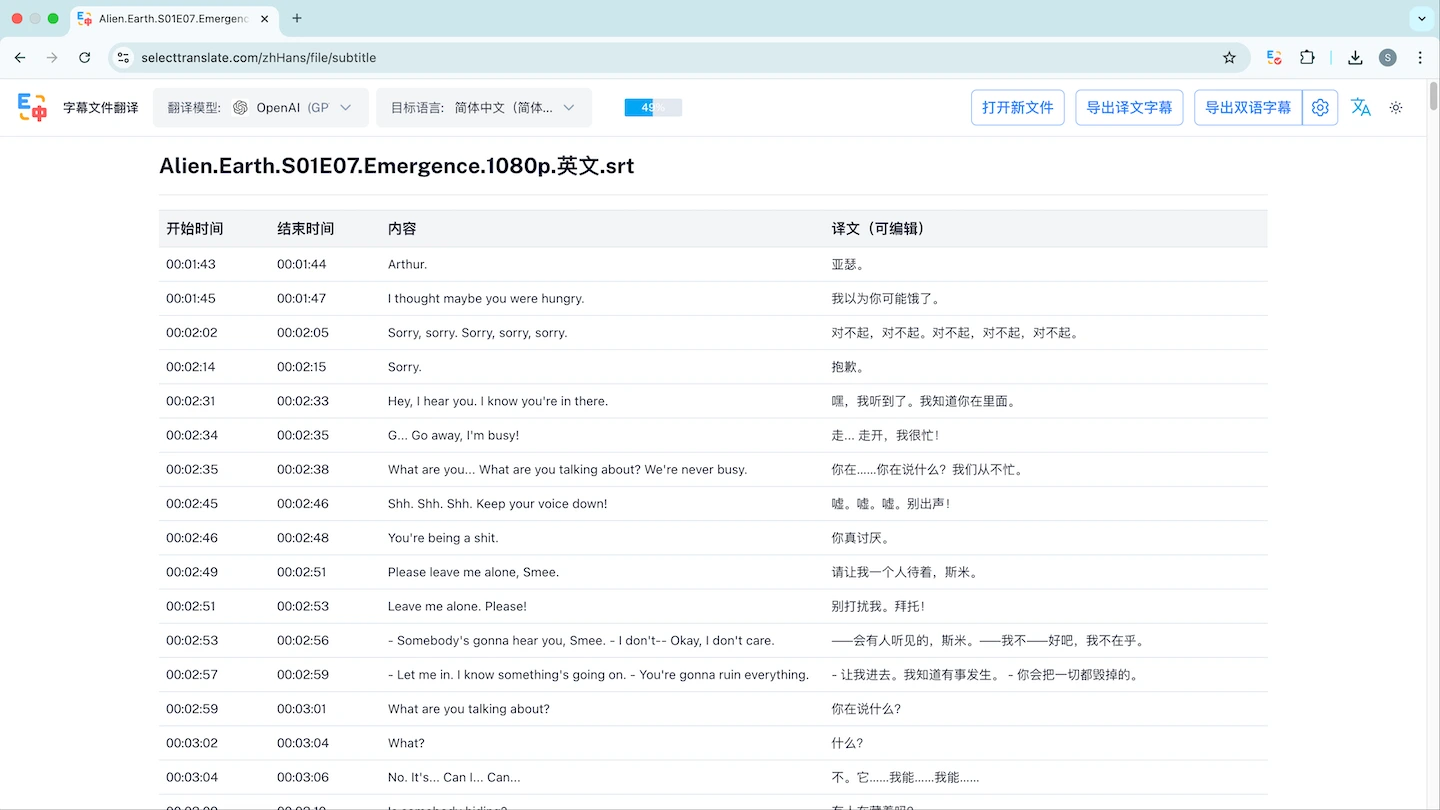 精挑翻译,支持 SRT、ASS、VTT、SSA、SBV、LRC 格式的字幕文件的翻译。按时间轴逐行翻译,支持翻译结果在线编辑并导出,帮助您快速制作高质量双语视频字幕。让外语电影、电视剧、纪录片、视频教程等轻松实现双语播放。